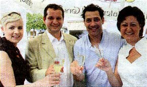 NÖN, 4. Juli 2011, TREFFPUNKT WIRTSCHAFT/WERBUNG - EMPFANG / Manager Gottfried Schwaiger, Assistentin Maria Reitzinger und Intendant Gregor Bloéb nutzten die Premiere, um allen Sponsoren zu danken. Als Geschenk gab es eine Theaterbühne im Kleinformat.